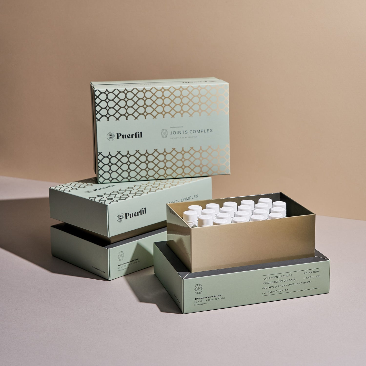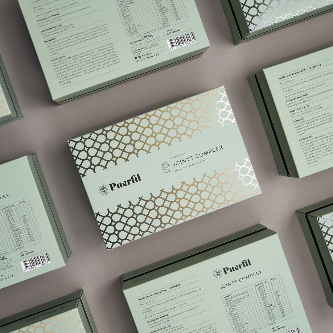 Puerfil Joints Complex je inovativni tečni dodatak ishrani razvijen kako bi aktivno podržao zdravlje zglobova, kostiju i vezivnih tkiva. Formulisan u EU, u saradnji litvanskih i švedskih stručnjaka, sadrži visoko efikasnu kombinaciju 5.000 mg hidroliziranog morskog kolagena, MSM-a, hondroitin sulfata i ključnih vitamina i minerala koji djeluju sinergijski na smanjenje upala i regeneraciju zglobova.