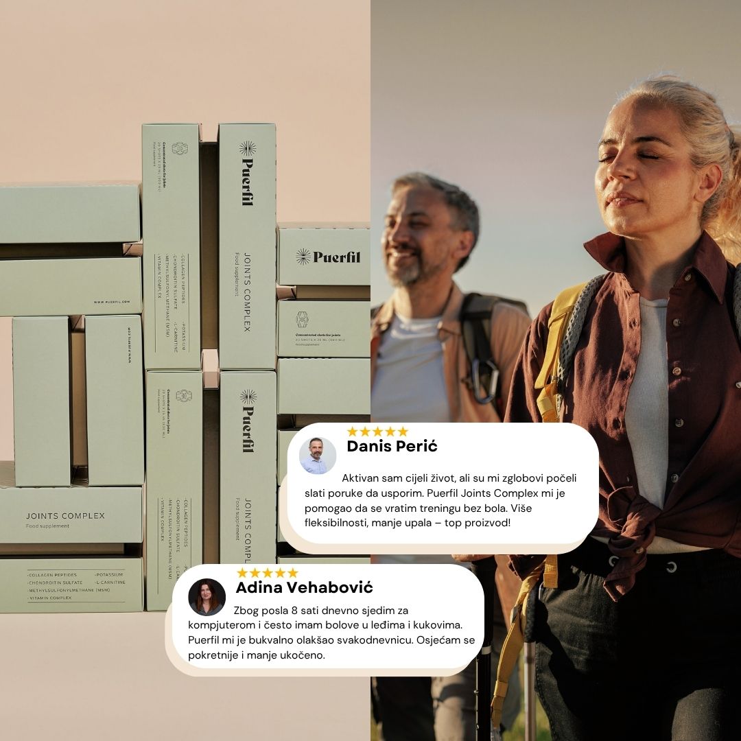Puerfil Joints Complex je tvoj saveznik za zdrave i pokretljive zglobove. Sadrži kolagen, MSM, hondroitin i vitamin C u visokoj koncentraciji.